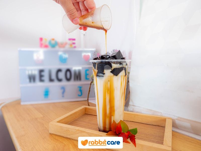 - เฉาก๊วยนมสด เติมน้ำแข็งผสมนมสด และไซรัปคาราเมล คนให้เข้ากัน ผสมในรสที่ชื่นชอบ เทเฉาก๊วยและน้ำเชื่อมด้านบน โรยน้ำตาลทรายแดงตามชอบ